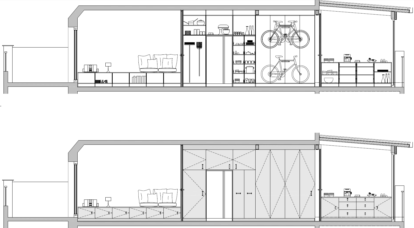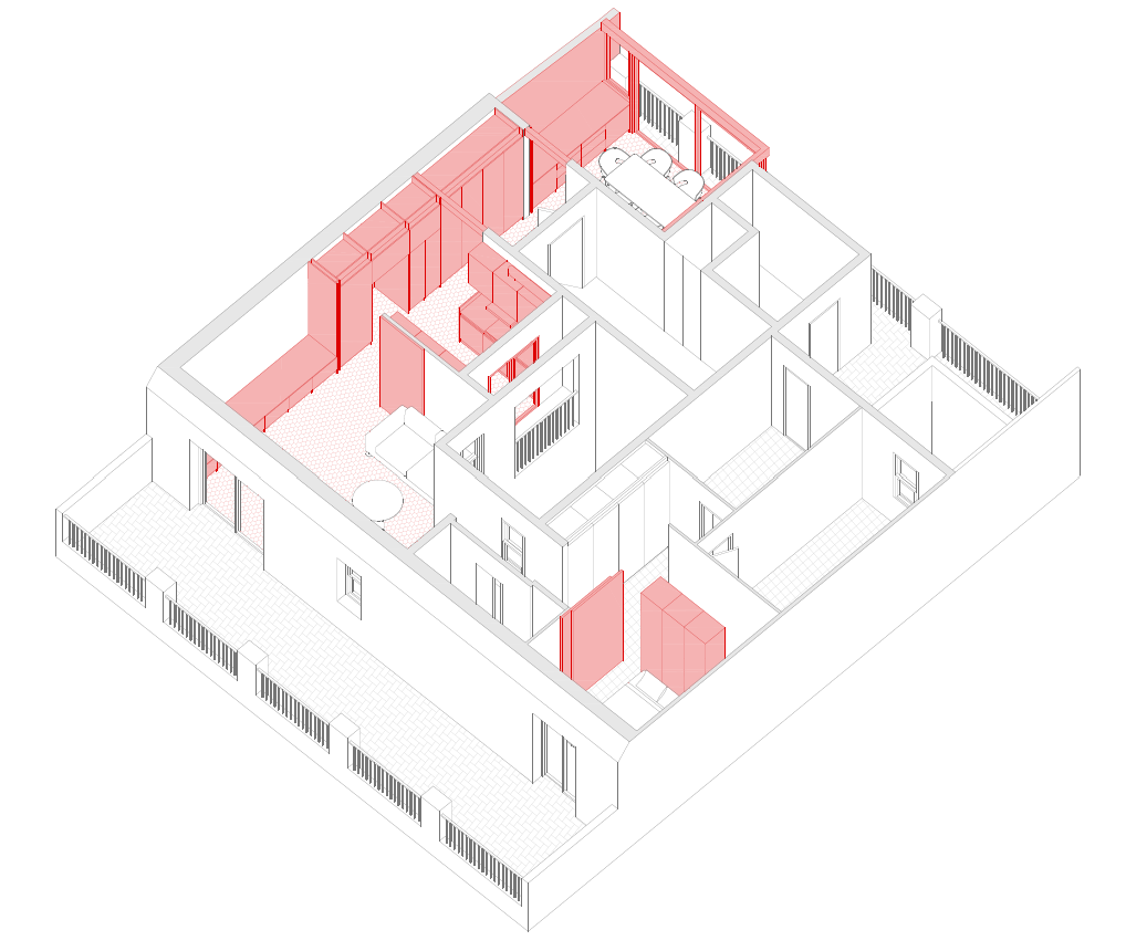 La reforma de este piso setentero barcelonés consiste principalmente en una redistribución de sus espacios diurnos mediante el posicionamiento de muebles de almacenaje. Un mueble principal se coloca a lo largo de una medianera, unificando cuatro estancias –recibidor, cocina, comedor, y salón– a la vez que se adapta a las necesidades de las mismas. El mueble sustituye parcialmente a un pasillo que anteriormente obligaba a bordear una cocina ahora abierta, más amplia y con más almacenaje, algo que siempre falta.