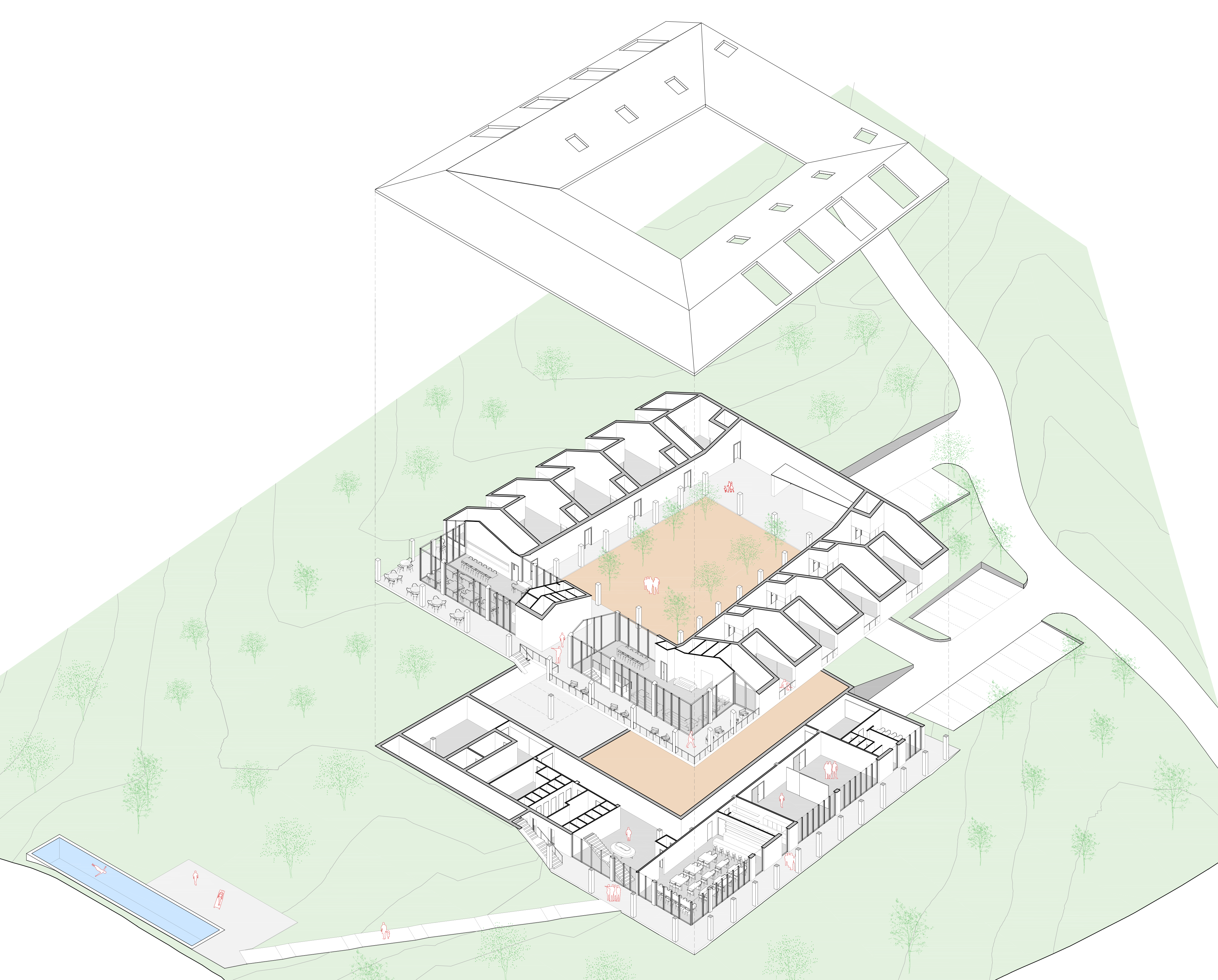 Situada a casi 1000 m de altitud en las montañas de Ronda, Andalucía, en una reserva natural que contiene restos arqueológicos ibéricos, esta propuesta de resort rural consta de un par de edificios ‘cortijo’ cuya modernidad solo se hace patente de cerca. Buscando nada más que minimizar su huella visual y ecológica en deferencia al paisaje, el proyecto aspira a ser arquitectónicamente discreto y silencioso.