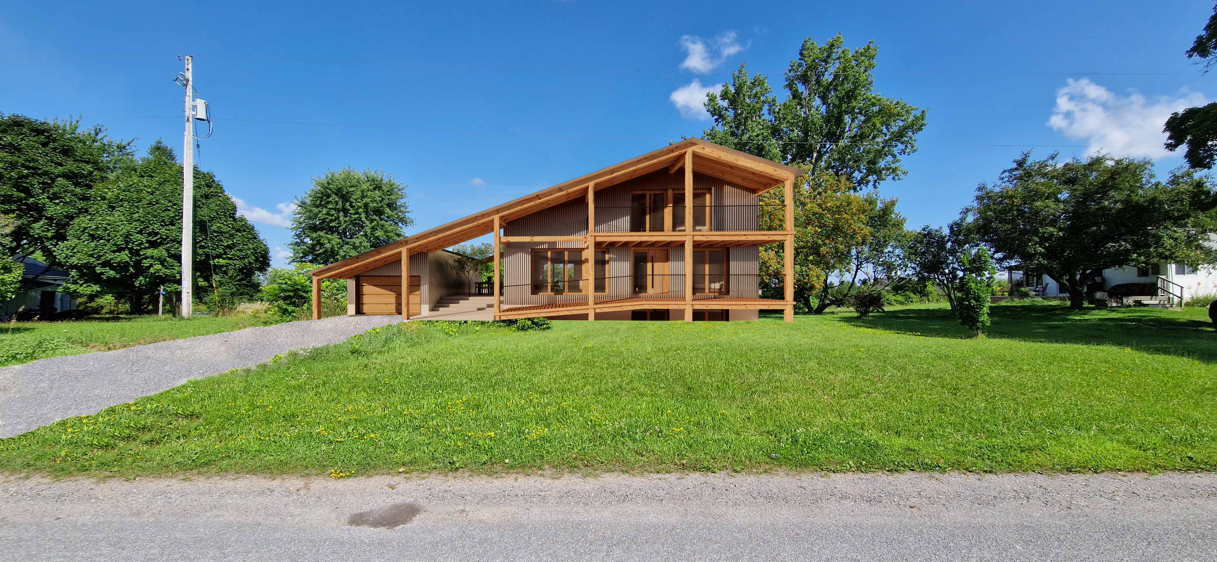Este proyecto de vivienda unifamiliar se sitúa en un entorno rural cerca de las orillas del lago Ontario, Canadá. Es para una productora de cine que necesita espacio para trabajar en casa, realizar talleres artísticos, y entretener y alojar a visitantes. El terreno tiene vecinos solo a los lados; las vistas frontales y traseras son enteramente de campos y pastizales que se extienden hasta donde alcanza la vista. El terreno suele recibir fuertes vientos del oeste que provienen del lago Ontario, lo que hace que se acumulen grandes dunas de nieve en invierno. Por lo tanto, era necesaria una forma arquitectónica que protegiera al máximo de estos vientos y al mismo tiempo capturara el calor solar en los meses invernales.