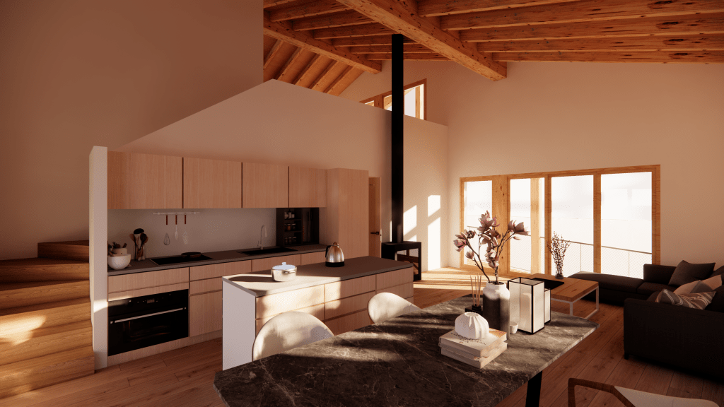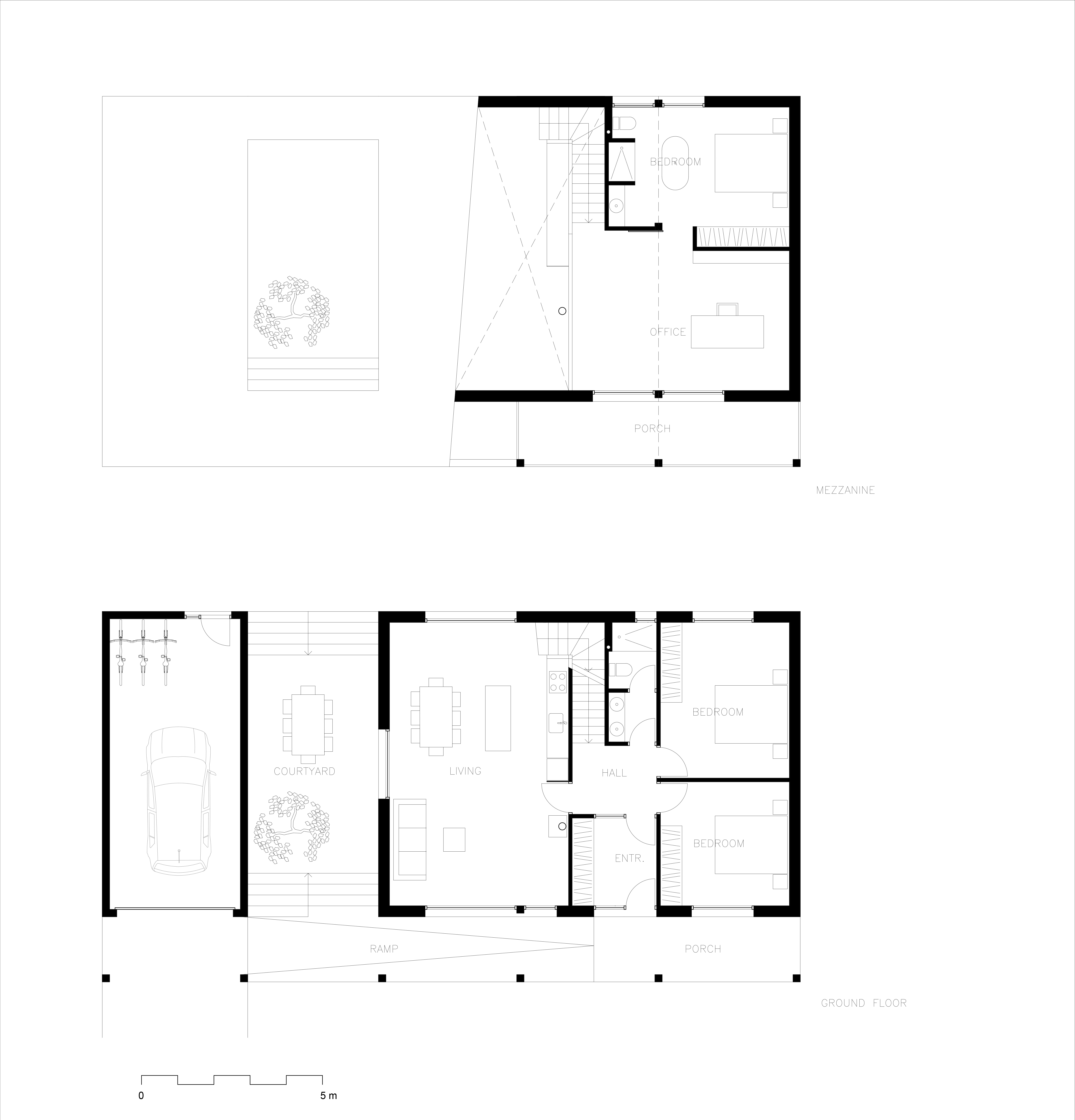 La asimétrica volumetría consta de un patio que separa un garaje de un volumen residencial, donde una sala de estar que contiene cocina y comedor se abre a un altillo con una oficina-biblioteca y un dormitorio en suite. Dos habitaciones de invitados, una esclusa de aire, un vestíbulo y un baño completan la planta baja. La sala de estar se puede convertir en un taller o espacio de reuniones reorganizando solo algunos de los muebles, incluida una isla de cocina sobre ruedas.