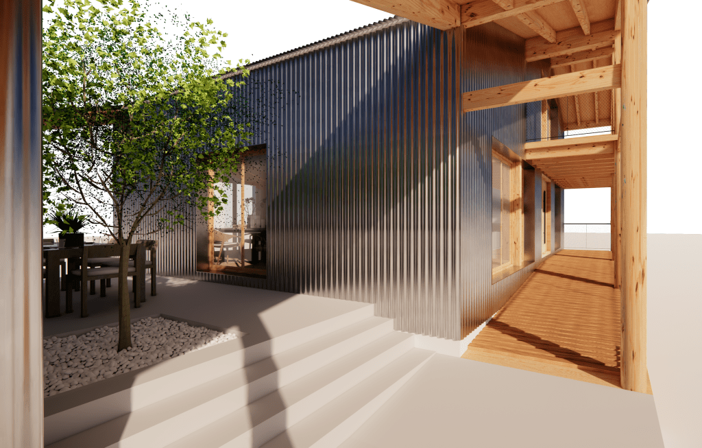 Para maximizar la privacidad y evitar molestar a los vecinos durante eventos, las vistas están orientadas exclusivamente hacia la parte delantera y trasera de la casa. El porche de dos pisos está diseñado para brindar sombra en verano, pero permitir que el sol de invierno ingrese a la casa. La construcción es de estructura de madera revestida completamente con acero galvanizado corrugado para maximizar la economía y reconocer el entorno agrario.